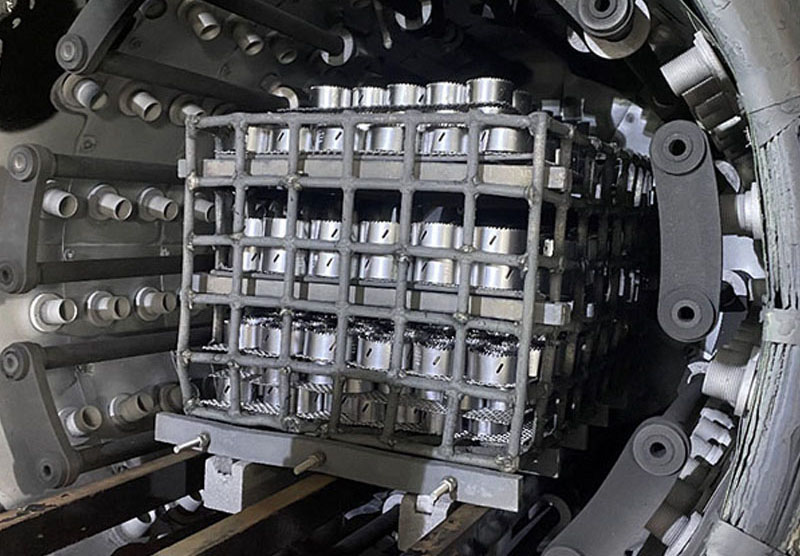 加熱室(爐膽)由隔熱層、加熱元件、石墨噴管和料臺等組成。隔熱層為三層石墨軟氈(20mm)和一層石墨硬氈(30mm)組成的圓形結(jié)構(gòu)。其結(jié)構(gòu)保溫性能好,硬氈特點:在氣淬時不會被強風吹掉保溫層,大大的提高了加熱室的使用壽命。隔熱層被固定在由不銹鋼板網(wǎng)和角鋼圈組成的加室框架上;前、后蓋裝有固定風門,風門邊上包有CFC材料防止氣流沖刷。 加熱元件采用石墨管,用陶瓷件絕緣。加熱元件沿隔熱層內(nèi)壁圓周方向均勻布置,加熱均勻、熱損失小;可單獨拆卸,且更換方便。石墨噴管為多列石墨噴管,均勻的沿隔熱層內(nèi)壁圓周方向分布在加熱室里。在氣淬時強制氣體均勻的從石墨噴管噴出,有效的達到均勻淬火。料臺由石墨支柱、石墨爐床和爐床上的Si2O3隔條組成。此結(jié)構(gòu)可防止高溫時料盤和石墨爐床的粘結(jié)。加熱溫區(qū)分為1區(qū)。1溫區(qū)獨立加熱,1溫區(qū)獨立控溫。整個圓形加熱室沿爐體長度方向劃分為一個環(huán)形單元。絕緣子采用高純氧化鋁絕緣瓷件,具備高溫絕緣。